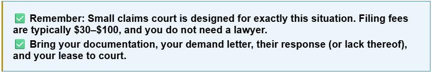 - If they do not comply, file a claim in small claims court. Most deposits fall well within small claims jurisdiction.